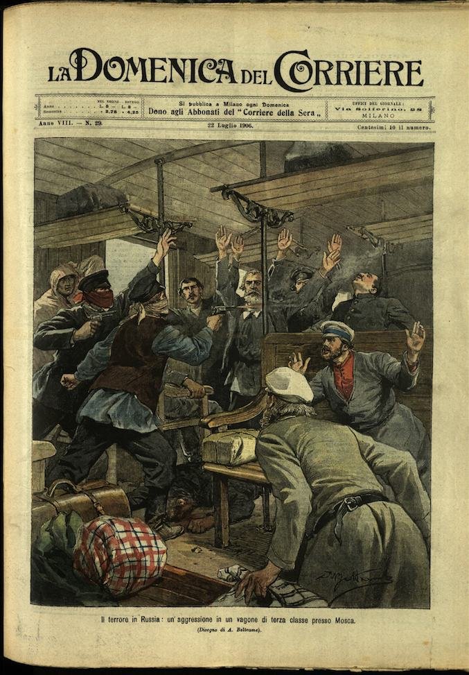 In-4, brossura, in buono stato di conservazione. In questo numero:"Credulita morbose, turba che invade una scuola presso Bari per salvare i figli dal dissanguamento.""Il terrore in Russia, un aggressione in un vagone di terza classe presso Mosca.".