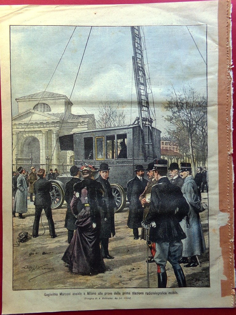 Guglielmo Marconi assiste a Milano alle prove della prima stazione radiotelegrafica mobile (Achille Beltrame)