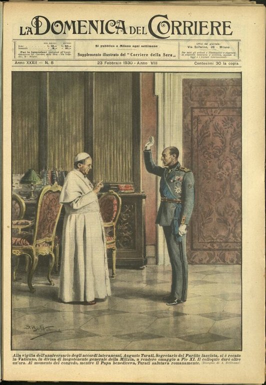 In-4, brossura, in buono stato di conservazione. In questo numero:"Alla vigilia dell'anniversario degli accordi lateranensi, agostoo Turati, Segretario del Partito fascista, si è recato in Vaticano, in divisa di luogotenente generale della Milizia, a rendere omaggio a Pio XI. Il colloquio duro oltre un'ora. Al momento del congedo, mentre il Papa benediceva, Turati salutava romanamente.""La cantante Emmy Destinn, morta a Praga, ha avuto funerali solenni e singolari. Un folto gruppo di signorine precedeva il carro funebre recando cartelli coi nomi dei personaggi lirici interpretati dalla celebre artista durante la sua carriera.".