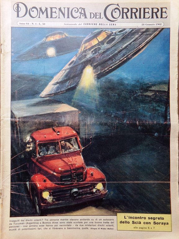 Inseguiti dai dischi volanti? Tre persone mentre stavano andando su di un autocarro da Tucuman (Argentina) a Buenos Aires sono state scortate per una buona tratta del percorso, così almeno esse hanno poi raccontato, da due misteriosi dischi volanti, muniti di potentissimi fari, che si libravano a bassissima quota (Walter Molino)