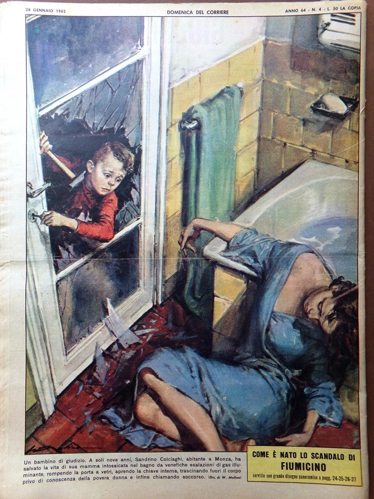 A soli 9 anni, Sandrino Colciaghi, abitante a Monza, ha salvato la vita di sua mamma intossicata nel bagno da venefiche esalazioni di gas illuminante, rompendo la porta a vetri, aprendo la chiave interna, trascinando fuori la donna e infine chiamando soccorso (Walter Molino)