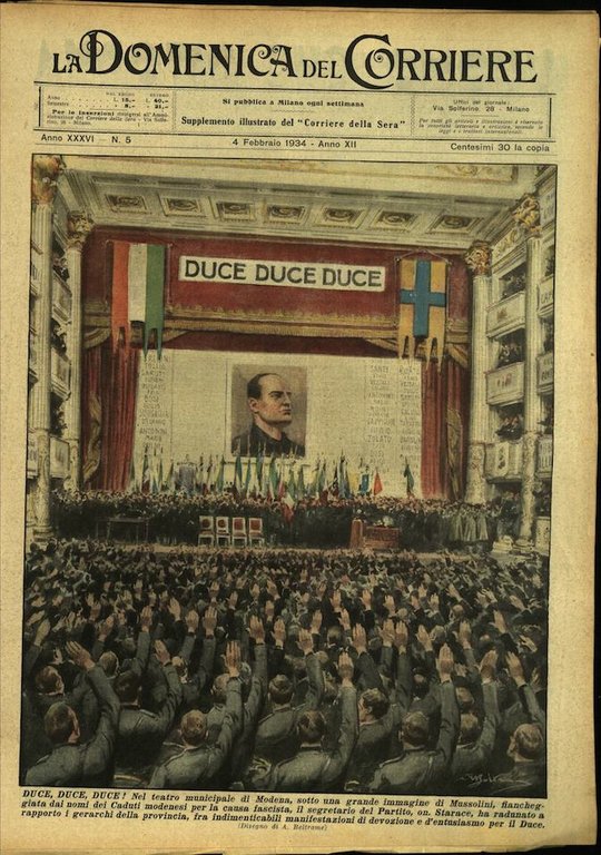 In-4, brossura, in buono stato di conservazione. In questo numero:"Duce, Duce, Duce! Nel teatro municipale di Modena, sotto una grande immagine di Mussolini, fiancheggiata dai nomi dei Caduti modenesi per la causa fascista, il segretario del Partito, on. Starace, ha radunato a rapporto i gerarchi della provincia, fra indimenticabili manifestazioni di devozione e d'entusiasmo per il Duce.""Tagliato in due! Durante una tempesta nel golfo di Biscaglia, un piroscafo mercantile spagnolo è stato sollevato come un fuscello e poi gettato contro uno scoglio, che lo ha letteralmente spaccato in due parti.".