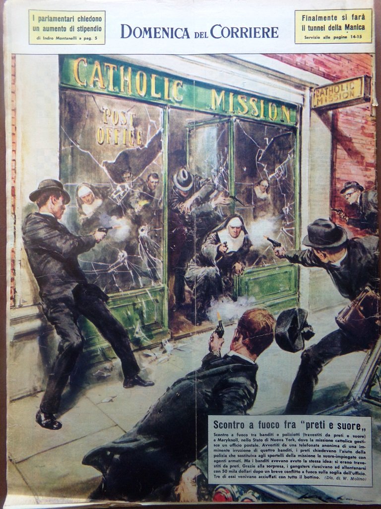 Scontro a fuoco tra banditi e poliziotti (travestiti da preti e suore) a Maryknoll, nello stato di New York, dove la missione cattolica gestisce un ufficio postale. Avvertiti da una telefonata anonima dell'imminente arrivo di quattro banditi i preti chiedevano l'intervento della polizia. 50 mila dollari il bottino presto recuperato (Walter Molino)
