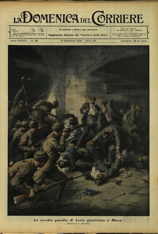 In-4, brossura, in buono stato di conservazione. In questo numero:"Un fulmine e un tesoro. Una rozza statua di arenaria che da tempo immemorabile si trovava nel cortile di una fattoria a Vranov, presso Praga, frantumata da un fulmine durante un temporale, ha rovesciato sotto gli occhi degli esterrefatti contadini una pioggia di monete d'oro e di gioielli.""La vecchia guardia di Lenin giustiziata a Mosca.".
