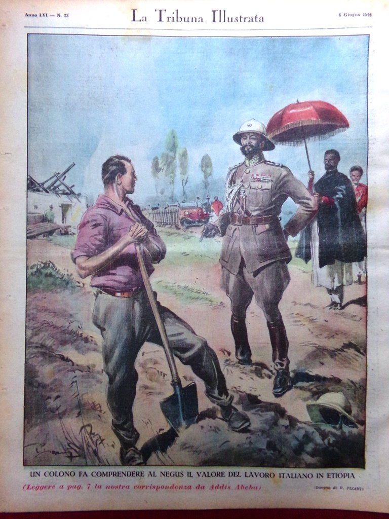 Un colono fa comprendere al Negus il valore del lavoro italiano in Etiopia (disegno di Vittorio Pisani)