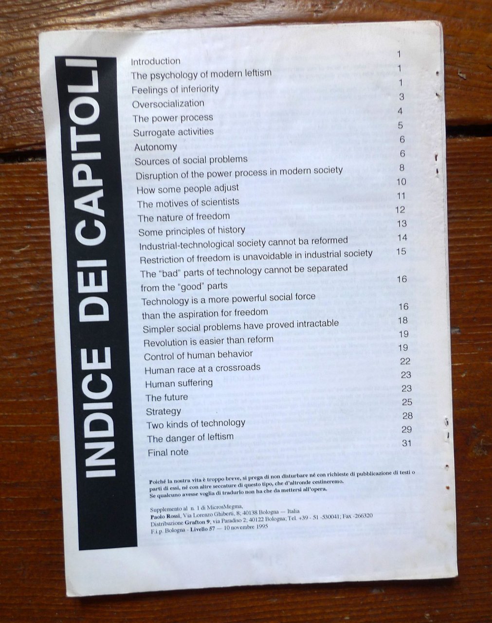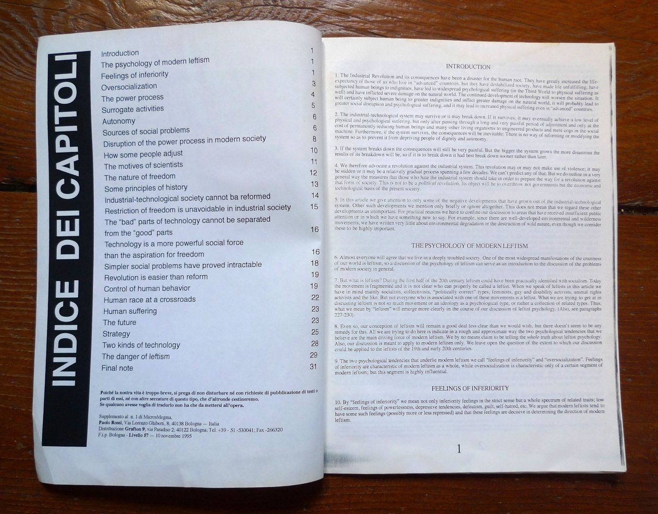 UNABOMBER: TIGHTENING THE NET.UNABOMBER'S MANIFESTO.Supplemento al n.1 di Micros Megma.Paolo Rossi / distribuzione Grafton 9, Bologna 1995,rilegatura con punto metallico, 30x21 cm., pp.32,testo in inglese,peso: g.300cos.10263CONDIZIONI DELL'OPUSCOLO: buone,pagine leggermente raggrinzite