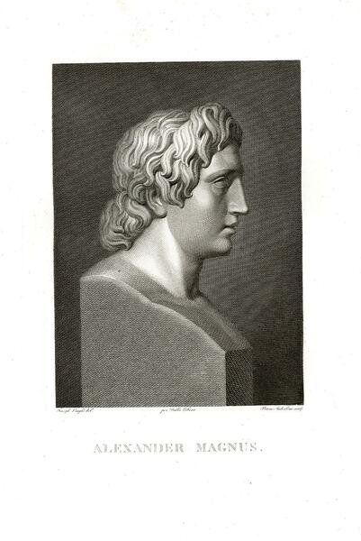 Incisione in rame, antica ed originale, raffigurante il ritratto il busto di Alessandro il Grande. In allegato pagine descritte da Davide bertolotti su l'illustre personaggio. Autore: Longhi dis & Pietro Anderloni inc. Luogo: Alessandro il Grande. Anno: 1823. Tecnica: incisione in rame. Dimensioni: 330x230 il foglio mm