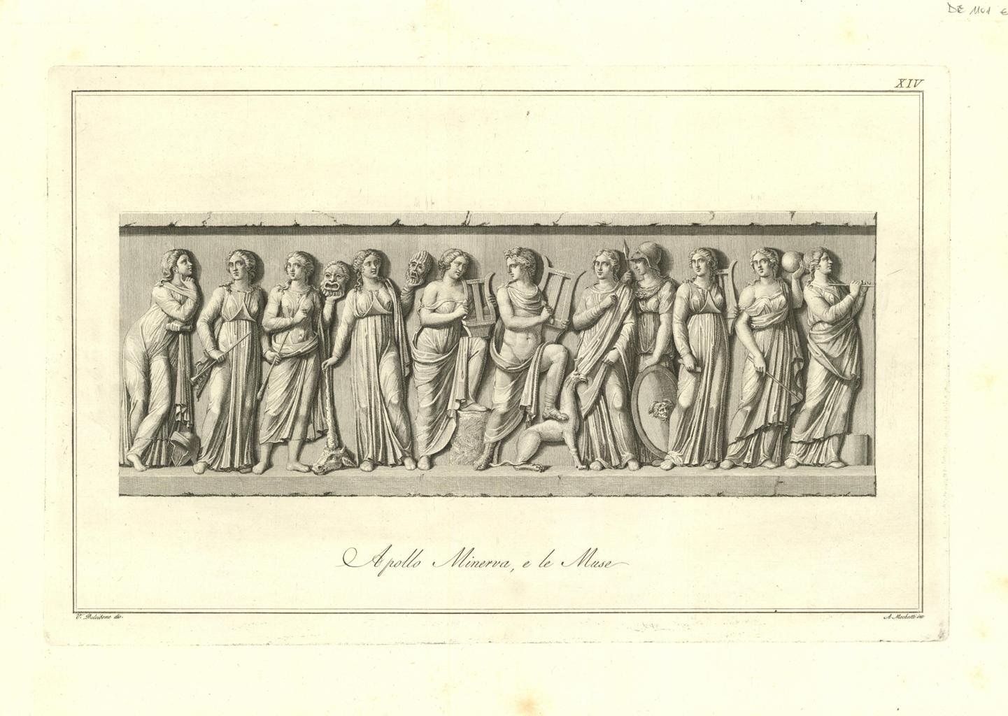 Questo bassorilievo raffigura una sequenza di bellissime muse. La prima, da sinistra è Clio, musa della storia, segue Euterpe, dea della musica con un flauto in mano, le maschere e l’abbigliamento ci mostrano Talia e Melpomene, muse della commedia e dell’armonia musicale. La quinta musa è Tersicore, protettrice della danza, poi Apollo, patrono della poesia a capo di tutte le muse, e Minerva, protettrice delle arti. Seguono Erato, musa della filosofia, Pollinia, maestra delle pantomime, Urania, musa dell’astronomia con il suo globo, e Calliope, maestra della poesia epica. Inserita nell'opera "Il Museo Pio-Clementino descritto da Ennio Quirino Visconti Presidente del Museo Capitolino - Tomo quarto - Dedicato alla Santità di Nostro Signore PIO SESTO Pontefice Massimo. Edito da Luigi e Giuseppe Mirri / Mercante di quadri incontro il Palazzo Bernini. In Roma MDCCLXXXIV con Privilegio Pontificio