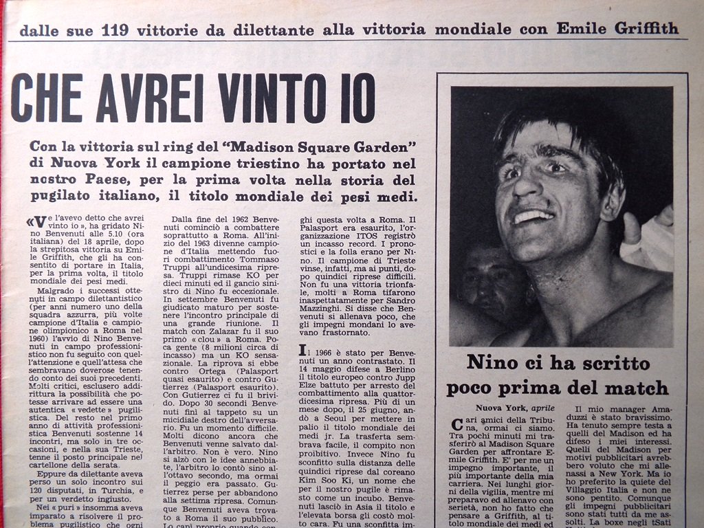 Articolo del 1967 La vittoria di Nino Benvenuti contro Emile Griffith Boxe Sasso