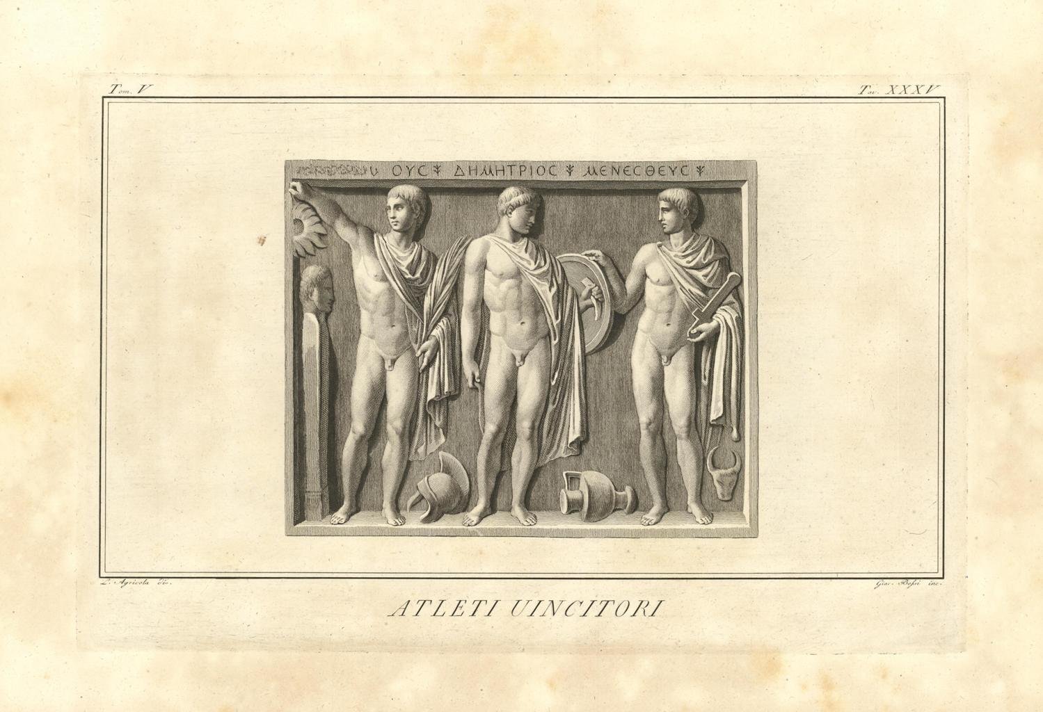 Il bassorilievo, con sfondo inciso, raffigura tre atleti romani. I loro nomi sono incisi nella parte superiore del bassorilievo, i loro corpi, proporzionati e tonici, vestono mantelli dalle belle pieghe. Inserita nell'opera "Il Museo Pio-Clementino descritto da Ennio Quirino Visconti Direttore del Museo Capitolino - Tomo quinto - Dedicato alla Santita di Nostro Signore PIO SESTO Pontefice Massimo. Edito da Luigi Mirri / Mercante di quadri incontro il Palazzo Bernini. In Roma MDCCXCVI con Privilegio Pontificio. Carta leggermente brunita