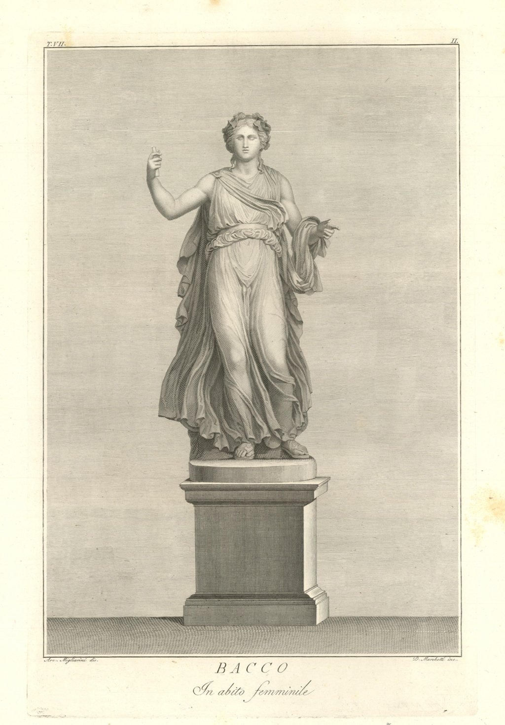 La statua, con sfondo inciso, ritrae Bacco vestito con un abito femminile. Dio del vino, della vendemmia e dei vizi, il suo culto (baccanale) arrivò nella penisola Italica nel II secolo a.C. Fin dall’infanzia fu così vestito, e anche durante il viaggio nelle Indie si travestì da donna per colpire di sorpresa i suoi avversari. Veste un abito quasi trasparente, svolazzante e dalle morbide pieghe. Inserita nell'opera "Il Museo Pio-Clementino" descritto da Ennio Quirino Visconti Membro dell'Istituto Nazionale di Francia e della Legione D'Onore conserv.re delle antichità nel museo Napoleone a Parigi - Tomo settimo - Dedicato alla Santità di Nostro Signore PIO SETTIMO Pontefice Massimo. Edito da Gasparre Gapparone scultore in gemme nella strada di S. Silvestro in Capite N° 42. In Roma MDCCCVII con Privilegio Pontificio
