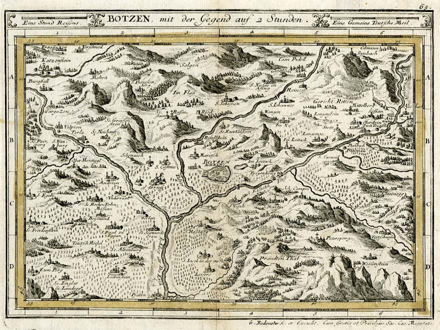 Incisione su rame di dimensioni 137x205 mm. Condizioni : USATO - Stato : Buono, ordinari segni d'uso e del tempo. Altre note : Incisione raffigurante Bolzano e le località raggiungibili con due ore di cammino ("mit der Gegend auf 2 Stund"). Si trova probabilmente in "Atlas Curieux oder Neuer und Compendieuser Atlas". Scheda bibliografica tratta da "Il territorio trentino-tirolese nell'antica cartografia" di Gino Tomasi.