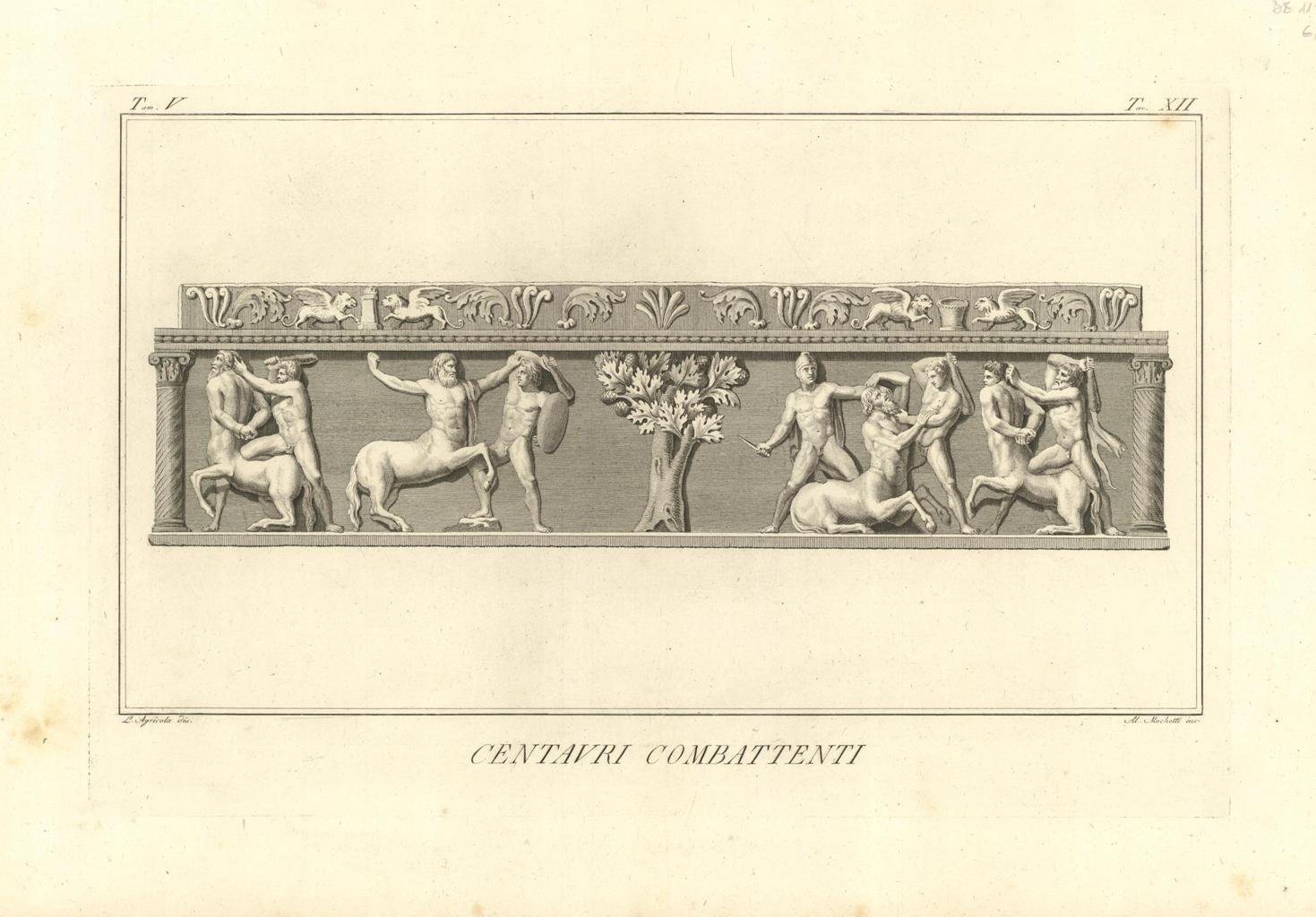 Il bassorilievo raffigura le battaglie tra centauri, creature mitologiche metà umane e metà equine, e fauni, divinità delle campagne con coda di capra. L’albero posto al centro delle due scene e le colonne laterali sostengono una fascia fregiata di minuti bassorilievi rappresentanti quattro grifoni e due are, o crateri. Inserita nell'opera "Il Museo Pio-Clementino descritto da Ennio Quirino Visconti Direttore del Museo Capitolino - Tomo quinto - Dedicato alla Santita di Nostro Signore PIO SESTO Pontefice Massimo. Edito da Luigi Mirri / Mercante di quadri incontro il Palazzo Bernini. In Roma MDCCXCVI con Privilegio Pontificio