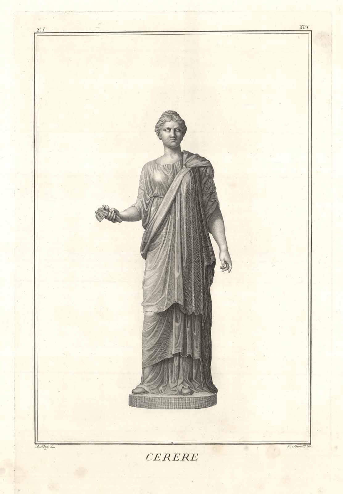 Incisione raffigurante Cerere inserita nel tomo primo dell'opera "Il Museo Chiaramonti aggiunto al Pio-Clementino da N. S. Pio VII P. N." Pubblicata da Antonio d'Este e Gaspare Capparone a Roma nel 1808. La divinità materna della terra e della fertilità qui indossa una lunga veste, ricca di pieghe, arricciata alle spalle da fibule e un mantello. Il crine è raccolto e intrecciato sulla sommità, in mano spighe e papaveri. Autore: Pozzi A. dis. & Savorelli P. inc. Luogo: Cerere. Anno: 1808. Tecnica: incisione in rame. Dimensioni: 620x430 il foglio.