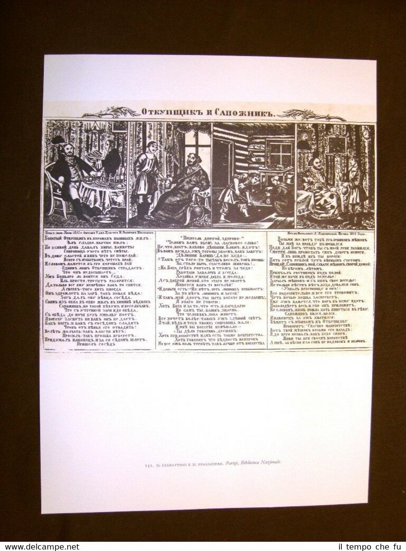 Stampa estratta da pubblicazione di metà '900 Il ciabattino e il finanziere Biblioteca nazionale Parigi + Sono il luppolo dalla testa alta Biblioteca Lenin Mosca Arte popolare russa Russia STAPO - 027 Dimensioni Fronte/retro Cm 25,00 x 34,00 + Cm 25,00 x 34,00 Qualora vogliate delle scansioni migliori contattateci, soddisferemo ogni vostra richiesta. Paypal Carta di credito Bonifico bancario Accuratamente adagiate su un cartoncino e protette da pellicola trasparente rigida, il tutto viene inserito dentro plico di adeguate dimensioni per proteggerne l'integrità.