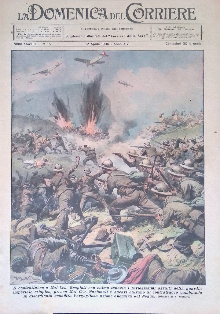 Il contrattacco a Mai Ceu. Respinti con calma tenacia i furiosissimi assalti della guardia imperiale etiopica, presso Mai Ceu, Nazionali e Ascari balzano al contrattacco cambiando in disordinata sconfitta l'azione offensiva del Negus (Achille Beltrame)
