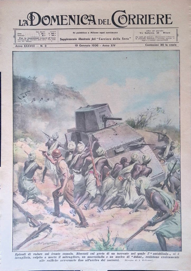 Episodi di valore sul fronte somalo. Bloccati sul greto di un torrente nel quale l'autoblinda si è incagliata, colpito a morte il mitragliere, un maresciallo e un nucleo di "dubat" resistono eroicamente alle raffiche avversarie fino all'arrivo dei soccorsi (Achille Beltrame)