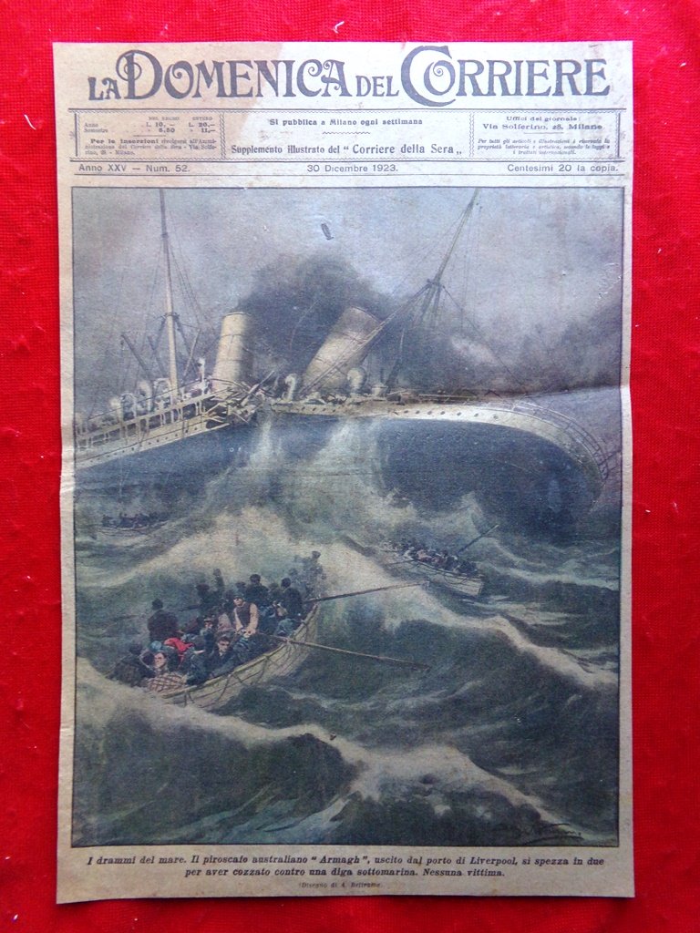 Copertina Domenica Corriere nr. 52 del 1923 Naufragio Piroscafo Armagh Liverpool