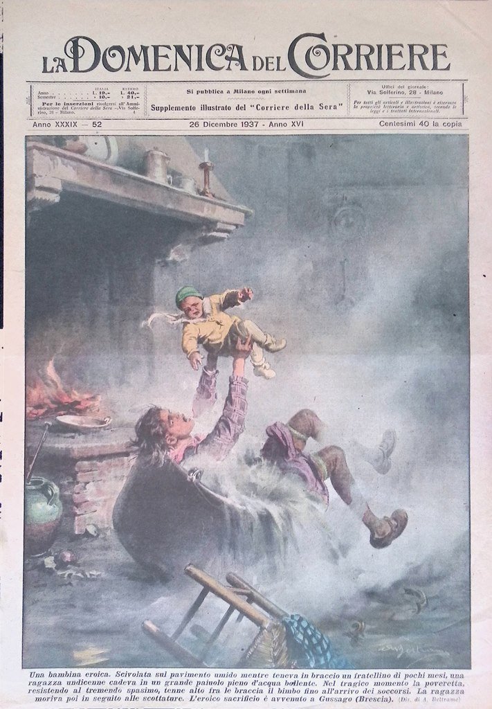 Una bambina eroica. Scivolata sul pavimento umido mentre teneva in braccio un fratellino, una ragazza undicenne cadeva in un grande paiolo pieno d'acqua bollente. Resistendo allo spasimo, tenne alto fra le braccia il fratellino fino all'arrivo dei soccorsi e poi moriva in seguito alle scottature. L'eroico sacrificio è avvenuto a Gussago (Brescia) (Achille Beltrame)