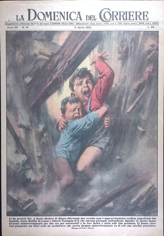 Li ha protetti Dio. A Santo Stefano di Magra (Sarzana) una vecchia casa è improvvisamente crollata seppellendo due bambini, Carlo Ruffini di 4 anni e Alberto Castagna di 2, che stavano giocando nell'androne. Squadre di operai hanno lavorato ininterrottamente per due ore per soccorlerli e la loro fatica è stata alla fine premiata. Li hanno ritrovati piangenti, ma illesi sotto un architrave che aveva formato miracolosamente su di essi una nicchia protettiva (Walter Molino)