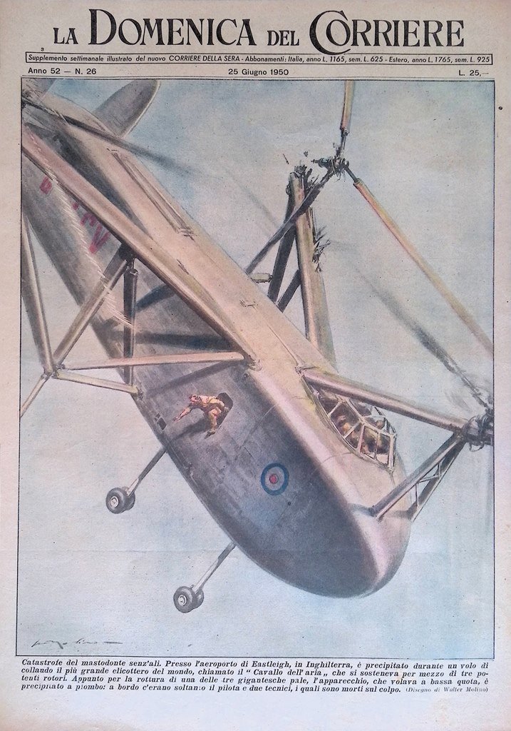 Catastrofe del mastodonte senz'ali. Presso l'aeroporto di Eastleigh in Inghilterra, è precipitato durante un volo di collaudo il più grande elicottero del mondo, chiamato il "Cavallo dell'aria" che si sosteneva per mezzo di tre potenti rotori. Appunto per la rottura di una delle tre gigantesche pale, l'apparecchio, che volava a bassa quota, è precipitato a piombo: a bordo c'erano soltanto il pilota e due tecnici, i quali sono morti sul colpo (Walter Molino)