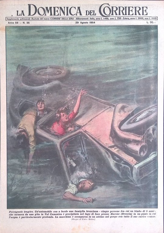 Ferragosto tragico. Un'automobile con a bordo una famiglia bresciana, cinque persone fra cui un bimbo di 5 anni, che tornava da una gita in Val Camonica precipitata nel lago di Iseo presso Marone (Brescia) in un punto in cui l'acqua particolarmente profonda. La macchina scomparsa in un attimo nel gorgo con tutto il suo carico umano (Walter Molino)