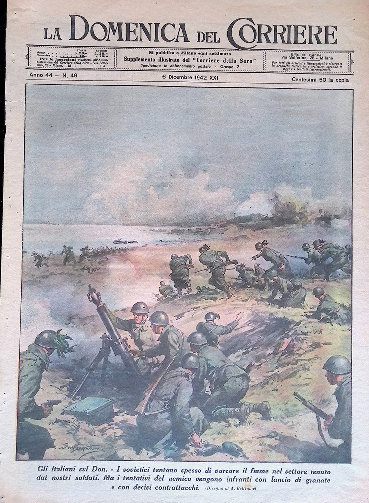 Gli italiani sul Don. I sovietici tentano spesso di varcare il fiume nel settore tenuto dai nostri soldati. Ma i tentativi del nemico vengono infranti con lancio di granate e con decisi contrattacchi (Achille Beltrame)