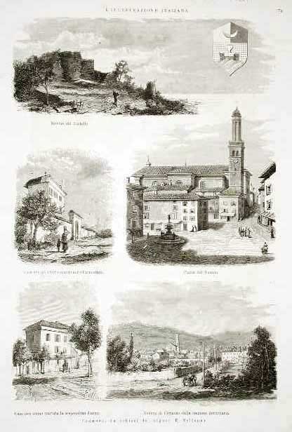 Insieme di cinque vignette con scorci del paese di Cormons, presso il confine austriaco. Testo al verso