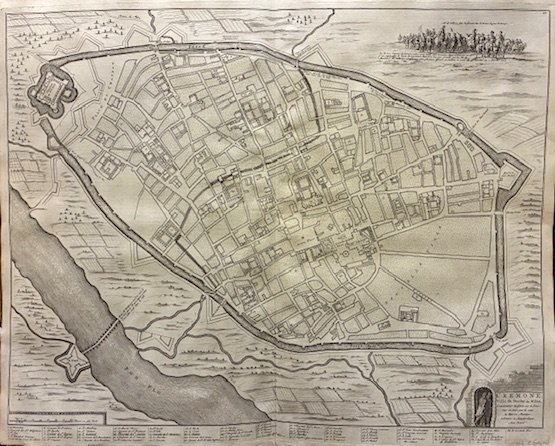 Incisione originale su rame (cm. 63,5x50 più margini bianchi) tratta dalla monumentale opera ‘Nouveau Theatre de l’Italie’, riedizione del ‘Theatrum Civitatum’ pubblicato da Joan Blaeu nel 1663. A destra in alto raffigurazione della riduzione in prigionia del Duca di Villeroy da parte del Principe Eugenio di Savoia avvenuta nel 1702 durante la Battaglia di Cremona. In basso legenda con 68 rimandi a monumenti, edifici, chiese ed altri luoghi notabili della città. Esemplare in nitida impressione ed eccellente stato di conservazione. Nel 1672 la tipografia di Blaeu fu distrutta da un incendio e l’editore Mortier rilevò ciò che restava delle lastre di rame (alcune delle quali ancora inedite), aggiunse nuove tavole e ritoccò - seppur con piccole modifiche - buona parte delle vedute originarie.