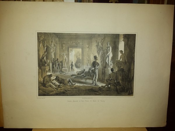 Litografia monocromatica 244 x 307 mm, su foglio 60 x 47 cm. Piccolo strappetto senza perdita di testo al margine binco inferiore. Proveniente da: "Collection de Vinck. Un siècle d'histoire de France par l'estampe, 1770-1870. Vol. 128, République de 1848. In basso a sinistra in piccolo:"N. d Natur gez u lith v Eugen Adam", in centro: "Druck und Verlag von Ed. Holzel in Wien". Più in basso centrato, il titolo:"Croaten-Quartier in Casa Picozzi bei Mestre vor Venedig". Eugen Adam (1817- 1880) è stato un pittore tedesco.Si è specializzato in dipinti di animali, di genere, di paesaggio e di battaglia. Aveva il suo atelier a Monaco e visse a Milano negli anni 1849-1858. Nel 1859 divenne reporter di guerra per la rivista Ueber Land und Meer. Nel 1861 partecipò a campagne svizzere, nel 1870 e nel 1871 nella guerra tra Francia e Germania. Suo padre Albrecht e i fratelli Julius , Franz e Benno erano anche pittori.Référence bibliographique: De Vinck, 15734.