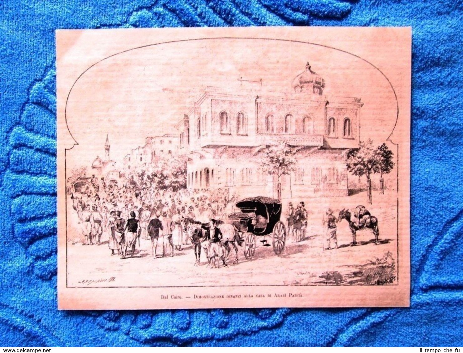 Rara Incisione Estratta da Rivista d'epoca del 1882 Dal Cairo - Dimostazione dinanzi alla casa di Arabì Pascià Dimensioni 22x17 II1882-026 Qualora vogliate delle scansioni migliori contattateci, soddisferemo ogni vostra richiesta. Paypal Carta di credito Bonifico bancario Accuratamente adagiate su un cartoncino e protette da pellicola trasparente rigida il tutto viene inserito dentro plico di adeguate dimensioni per proteggerne l'integrità
