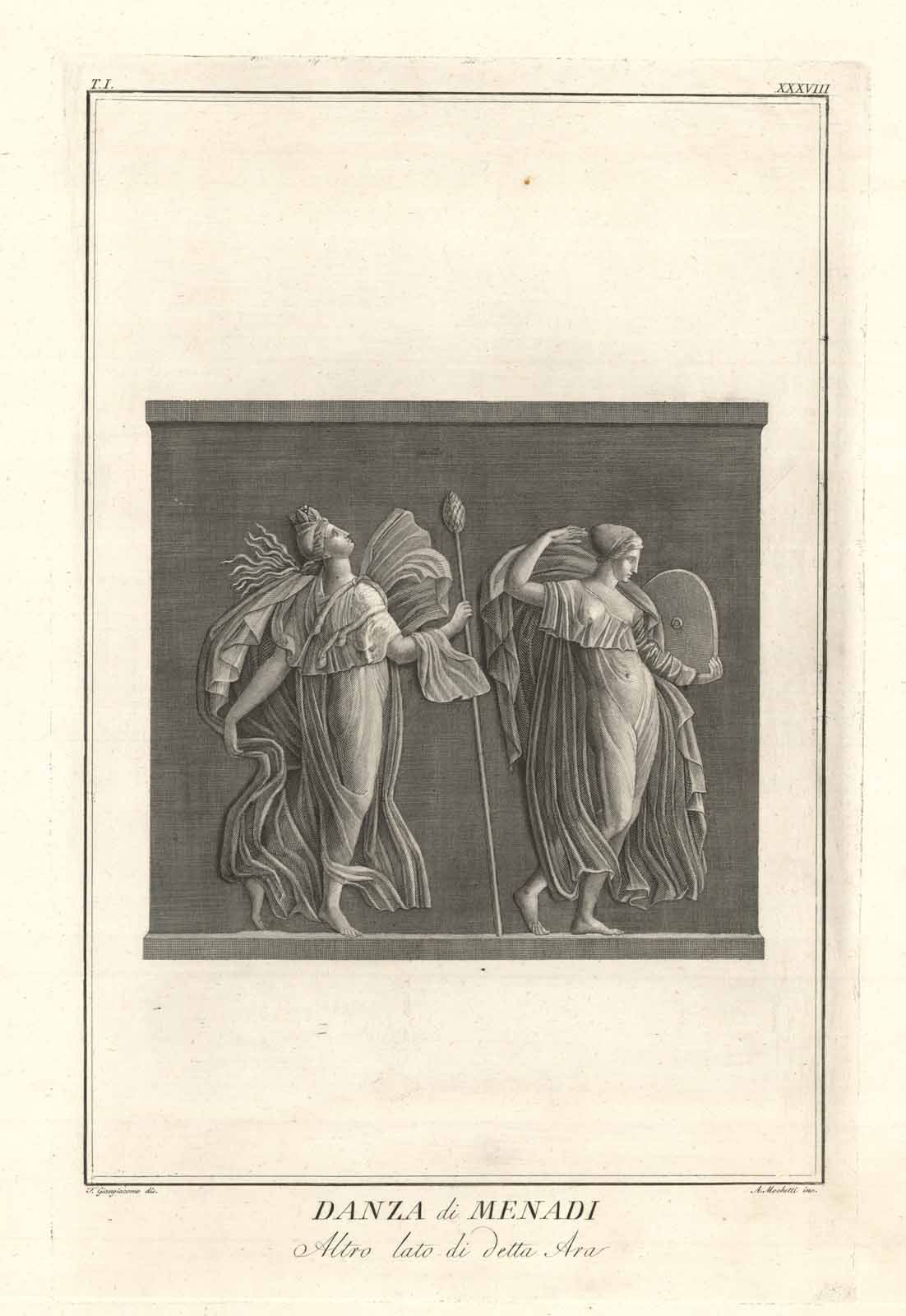 Incisione raffigurante Menadi danzanti inserita nel tomo primo dell'opera "Il Museo Chiaramonti aggiunto al Pio-Clementino da N. S. Pio VII P. N." Pubblicata da Antonio d'Este e Gaspare Capparone a Roma nel 1808. Bassorilievo raffigurante due Menadi in preda all'ebbrezza dionisiaca. Autore: Giangiacomo F. dis. & Mochetti A. inc. Luogo: Menadi. Anno: 1808. Tecnica: incisione in rame. Dimensioni: 620x430 il foglio.