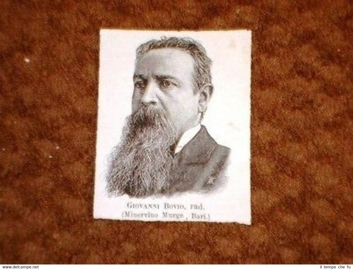 RARA STAMPA ESTRATTA DA RIVISTA D'EPOCA Deputato Giovanni Bovio di Minervino, Bari II1874-011T Dimensioni Cm 6,50 x 8,50 Qualora vogliate delle scansioni migliori contattateci, soddisferemo ogni vostra richiesta. Paypal Carta di credito Bonifico bancario Accuratamente adagiate su un cartoncino e protette da pellicola trasparente rigida il tutto viene inserito dentro plico di adeguate dimensioni per proteggerne l'integrità