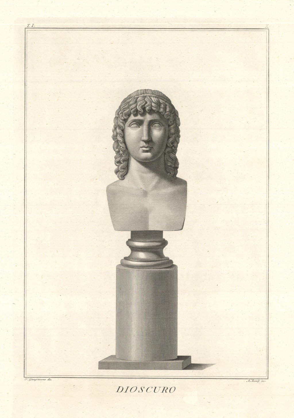 Incisione raffigurante, uno dei dioscuri, inserita nel tomo primo dell'opera "Il Museo Chiaramonti aggiunto al Pio-Clementino da N. S. Pio VII P. N." Pubblicata da Antonio d'Este e Gaspare Capparone a Roma nel 1808. Busto di dioscuro, probabilmente Castore per la suddivisione della capigliatura. Autore: Giangiacomo F. dis. & Aureli N. inc. Luogo: Dioscuro. Anno: 1808. Tecnica: incisione in rame. Dimensioni: 620x430 il foglio.