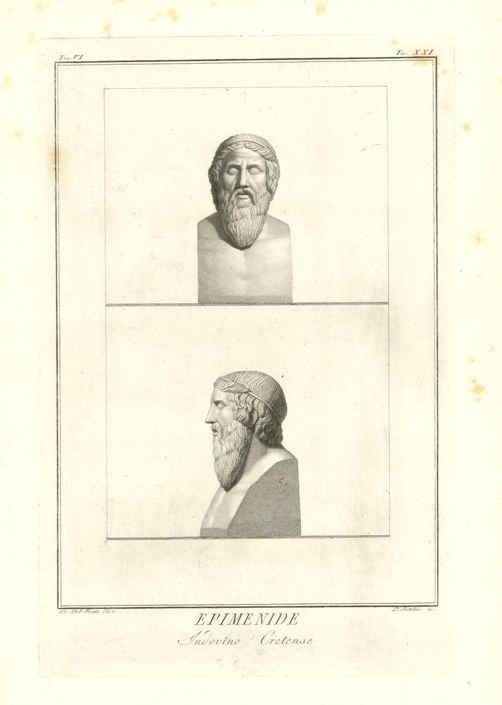 Il busto, ripreso da due punti di vista, ritrae Epimenide, uno scrittore e filosofo greco antico. La chioma è ripresa sopra le tempie da un nastro e il suo volto è disteso e rilassato. Inserita nell'opera "Il Museo Pio-Clementino descritto da Ennio Quirino Visconti Direttore del Museo Capitolino - Tomo sesto - Dedicato alla Santita di Nostro Signore PIO SESTO Pontefice Massimo. Edito da Luigi Mirri / Mercante di quadri incontro il Palazzo Bernini. In Roma MDCCXCII con Privilegio Pontificio. Opera dedicata ai Busti del Museo Pio-Clementino. Leggeri segni di foxing ai margini