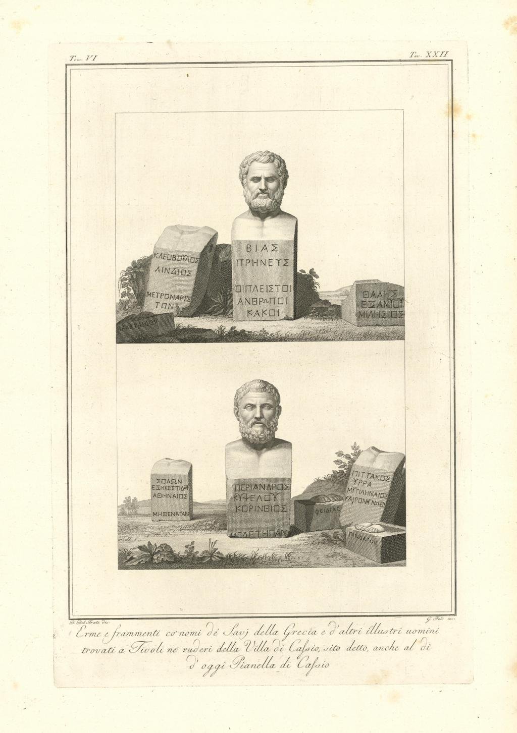 Erme e frammenti cò nomi dè Savj della Grecia e d’altri illustri uomini / trovati a Tivoli né ruderi della Villa di Cassio, sito detto, anche al dì / d’oggi Pianella di Cassio | Stampe | Del Frate D. dis. & Folo G. inc., Del Frate D. dis. & Folo G. inc.