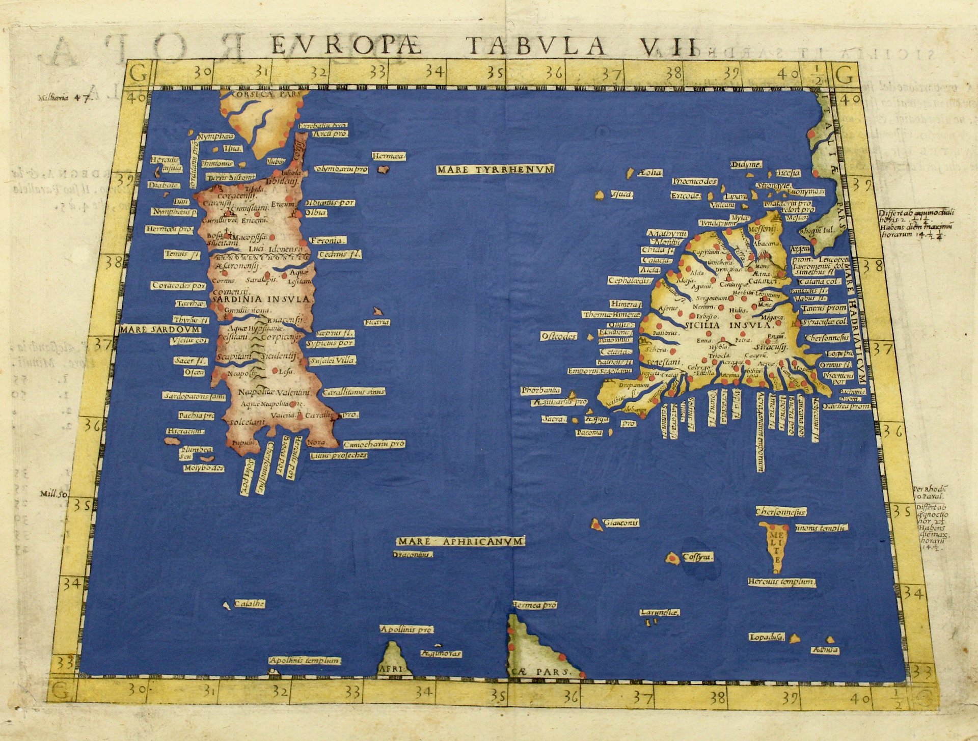 Incisione in rame, dipinta a mano, mm 190x263. Tratta dall'edizione veneziana della "Geographia" di Tolomeo curata da Ruscelli. Si tratta della carta "antica" relativa alle isole di Sardegna e Sicilia, secondo la visione tolemaica; al verso testo descrittivo e curioso in italiano.Tolomeo, il più grande cartografo dell'antichità, pubblicò La Geografia nel 150 d.C.; nel medioevo sopravvisse, grazie alla mediazione araba, manoscritta in greco e fu poi tradotta in latino da Jacopo D'Angelo; da inizio Quattrocento acquisì sempre più notorietà e nel 1477 fu pubblicata a Bologna la prima edizione illustrata a stampa comprendente solo carte del mondo antico, immediatamente seguita da altre edizioni nel 1478, -80, -82 che già presentavano alcune carte del mondo moderno. Con il susseguirsi delle edizioni, si incrementò il numero delle carte moderne consci che il mondo fosse ben diverso da quello di Tolomeo, fino a giungere alla celebre edizione del 1513 di Waldseemueller, il primo atlante moderno, composto da 20 carte nuove oltre alle antiche. Nel corso del XVI secolo ed oltre vennero poi editate numerose edizioni. Girolamo Ruscelli (1500-1566) nasce a Viterbo ed è un importante scrittore ed editore, che dopo aver studiato a Padova trascorse la propria carriera fra Roma e Napoli, dove morì. <BR>Ottimo esemplare in fascinosa coloritura in stile tolemaico, piccolo restauro al margine inf. ds che non interessa minimamente l'incisione. <BR>