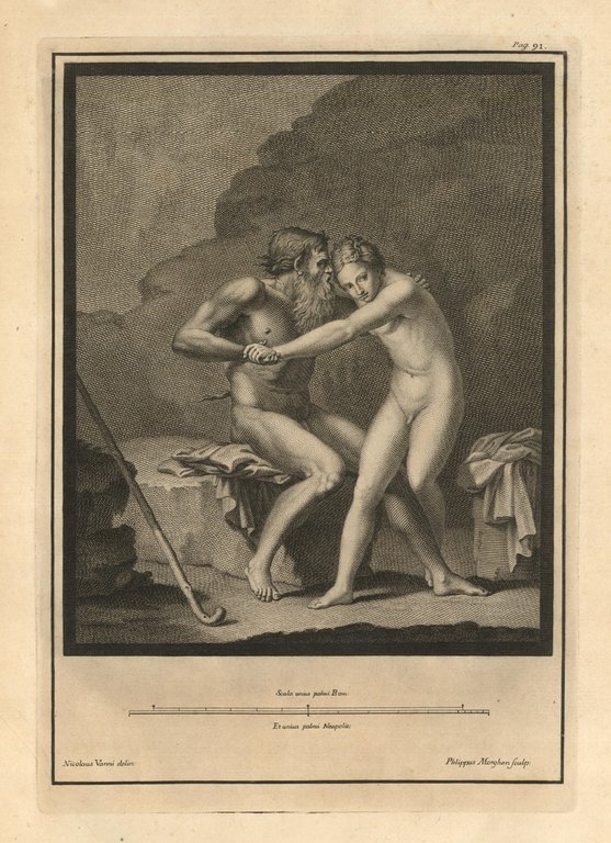 Incisione raffigurante un Fauno che cerca di baciare un Ninfa. Tratta dal tomo primo della monumentale opera "Le Pitture antiche d'Ercolano e contorni incise con qualche spiegazione", sontuosamente illustrata da diversi artisti tra i quali: Giuseppe Aloja, Nicola Billi, Pietro Campana, Nicola Cesarano, P. Gaultier, Francesco Martano, Filippo Morghen, Camillo Paderni, Rocco Pozzi, N. Ricci, Nicola Vanni, Francisco de Vega. Edita a Napoli dalla Regia Stamperia nel 1757