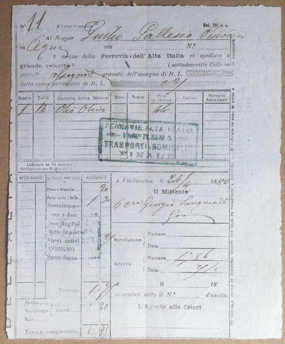 Ferrovie Alta Italia - 1880 - bolletta di spedizione - Finale