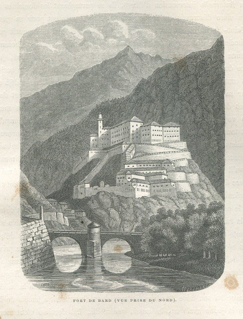 Veduta di Fort de Bard, presa da nord.Tratta dall'opera " La Vallée d'Aoste " stampata a Parigi da Amyot