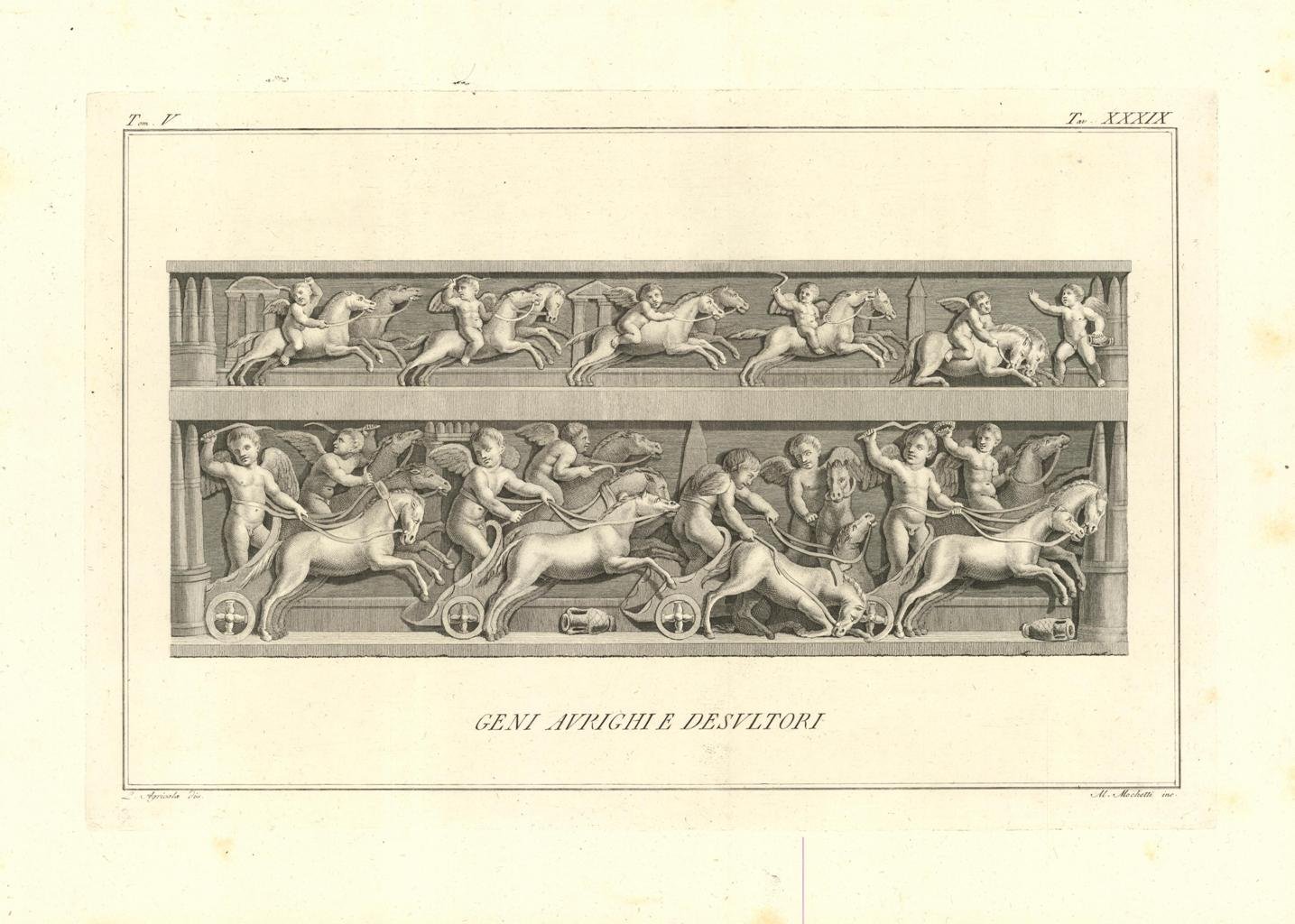 Il bassorilievo rappresenta le corse al circo. I personaggi, in movimento, sono quindi cavalli e fanciulli alati che volteggiano e si rincorrono velocemente. Inserita nell'opera "Il Museo Pio-Clementino descritto da Ennio Quirino Visconti Direttore del Museo Capitolino - Tomo quinto - Dedicato alla Santita di Nostro Signore PIO SESTO Pontefice Massimo. Edito da Luigi Mirri / Mercante di quadri incontro il Palazzo Bernini. In Roma MDCCXCVI con Privilegio Pontificio