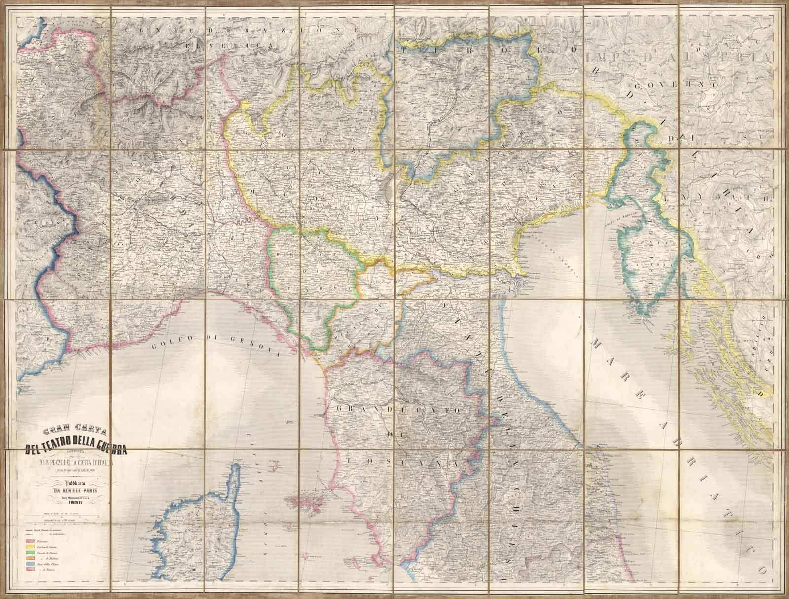 Grande carta geografica dell'Italia Settentrionale, applicata su tela a stacchi, realizzata da Achille Paris di Firenze. Da notare quanto dichiarato nel titolo "composta di 8 pezzi della carta d'Italia." infatti il Teatro della Guerra è dato dall'unione dei fogli 2-3-4-5, 8-9-10-11 della monumentale "Carta Geografica dell'Italia" in trenta tavole che il Paris eseguì nel 1854. Risulta così interessante vedere e toccare con mano il lavoro editoriale di Achille che andando ad aggiungere un nuovo cartiglio al foglio 8 riesce così a realizzare una carta nuova adatta alle esigenze del momento. Si noti che questo era un espediente già praticato dagli editori più attenti alle necessità dei loro clienti, anche nei secoli passati. La carta è caratterizzata da una vivace coloritura confinale all'acquerello. Complessivamente gode di uno stato di conservazione molto buono. Difficile a reperirsi in questo stato