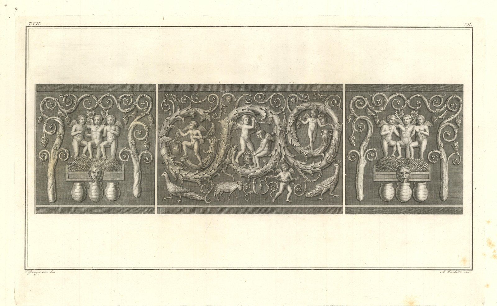 Rappresentazione dei lati del bellissimo bassorilievo, con sfondo inciso, di un’urna di gran pregio. Le facce del sarcofago sono ornate da putti che pestano l’uva, da animali e uccelli. Inserita nell'opera "Il Museo Pio-Clementino" descritto da Ennio Quirino Visconti Membro dell'Istituto Nazionale di Francia e della Legione D'Onore conserv.re delle antichità nel museo Napoleone a Parigi - Tomo settimo - Dedicato alla Santità di Nostro Signore PIO SETTIMO Pontefice Massimo. Edito da Gasparre Gapparone scultore in gemme nella strada di S. Silvestro in Capite N° 42. In Roma MDCCCVII con Privilegio Pontificio. Leggero foxing ai margini