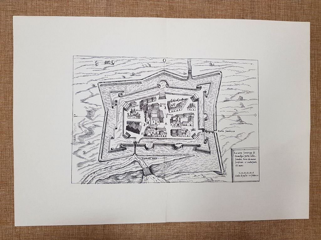 Gravelines o Grevelingen Città e fortezze del mondo Ballino 1569 Ristampa (2) Rara stampa estratta da pubblicazione del 1982 Stampata su carta speciale Gravelines o Grevelingen Francia Codice prodotto: CCII-060 Dimensioni: Cm 42,00 x 29,00 Ristampa di una stupenda tavola contenuta nella celebre e molto rara opera "De' disegni delle più illustri città et fortezze del mondo". Pubblicata a Venezia nel 1569 da Bolognino Zaltieri in collaborazione con Giulio Ballino, rappresenta un capolavoro del suo tempo per l'eccezionale qualità e il livello di dettaglio delle sue tavole incise. Giulio Ballino, con grande perizia artistica e storiografica, ha raccolto e descritto cinquanta di città e fortezze rinomate in tutto il mondo, proponendo non solo una rappresentazione visiva straordinaria, ma anche una narrazione storica concisa e significativa. Le tavole, realizzate in un'epoca in cui la cartografia e l'arte della stampa erano ancora in evoluzione, si distinguono per la loro rara bellezza e precisione. Ogni incisione è un'opera d'arte a sé stante, capace di catturare l'essenza architettonica e topografica delle località descritte. In particolare, queste tavole offrono uno sguardo affascinante sulla struttura e la disposizione delle città fortificate, riflettendo le tecniche difensive e le innovazioni militari dell'epoca. La rarità di queste tavole è ulteriormente accentuata dal fatto che furono realizzate in un periodo storico caratterizzato da significativi cambiamenti politici e sociali. Le città e le fortezze storico caratterizzato da significativi cambiamenti politici e sociali. Le città e le fortezze illustrate non solo rappresentano importanti centri del mondo antico, ma testimoniano anche la grandezza e l'influenza di civiltà passate offrendo una finestra privilegiata sulla storia e sulla cultura di diverse regioni, dalla prosperosa Venezia alle imponenti fortezze dell'Europa e dell'Asia, fino alle meraviglie del Nuovo Mondo. L'opera di Giulio Ballino si distingue per la sua capacità di combinare arte e storia suscitando l'ammirazione e lo stupore di studiosi e appassionati. La rarità delle tavole e la loro impeccabile esecuzione ne fanno testimonianza preziosa e insostituibile del patrimonio culturale e artistico del XVI secolo.