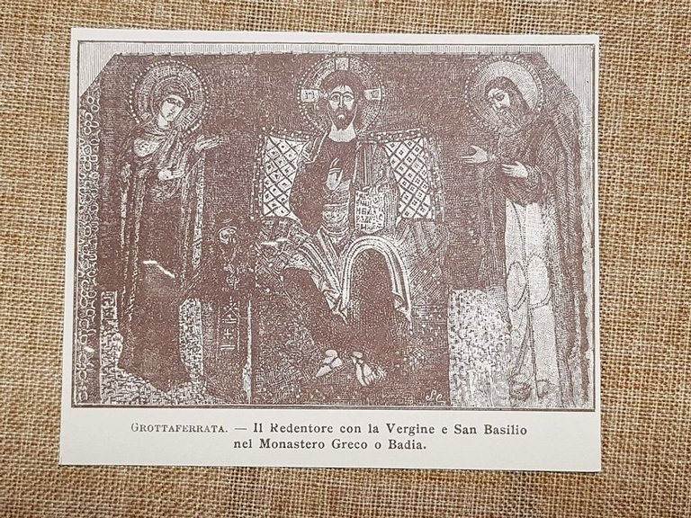 Rara stampa estratta da pubblicazione di fine '900 Raffigurazione sacra custodita nel Monastero Greco di Grottaferrata, che presenta al centro il Redentore affiancato dalla Vergine e da San Basilio, in un’iconografia tipica della tradizione bizantina. L’opera, collocata all’interno della chiesa abbaziale, si distingue per la ricchezza cromatica, l’oro di fondo e la solennità delle figure, simboli di intercessione e protezione per la comunità monastica. La composizione, di grande valore devozionale e artistico, riflette la continuità del rito greco-cattolico e la storia millenaria della Badia, fondata da San Nilo nel 1004. Dimensioni Cm 13,00 x 10,00 Codice prodotto: LCCI - 030 PayPal Carta di credito Bonifico bancario Inserita dentro plico di adeguate dimensioni per proteggerne l'integrità Spedizione con posta ordinaria o raccomandata scelta dall’Acquirente nel momento del pagamento Clicca qui per accedere al nostro Store ed al suo sterminato archivio
