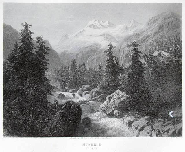 Stampa antica ed originale con veduta panoramica della valle e del massiccio