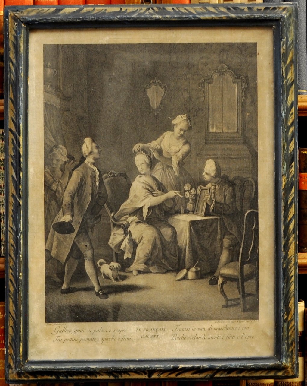 Incisione all'acquaforte di mm 398 x 295 alla battuta. Il foglio è inserito nella sua bella cornice verde originale settecentesca, con il vetro dell'epoca. Sotto al centro "Le François galant" e lateralmente "Gallico genio si palesa e scopre Tra pettini, pomate, e specchi e fiori, Tentasi in van di mascherare i cori, Poichè svelan la mente i fatti e l'opre". Il foglio fa parte di una serie di incisioni di Wagner da dipinti di Maggiotto e Berardi, a proposito di uno dei quali Succi afferma "La scenetta fu attinta dal Wagner dal repertorio che Maggiotto andava svolgendo al di fuori della linea accademica e aulica. Il successo di questa piacevoli composizioni fu notevole e la loro richiesta da parte di un certo tipo di collezionismo meno impegnato fu sicuramente promossa dalla large diffusione delle stampe di Wagner e di Volpato". Come è noto la bottega di Wagner fu per tutta la seconda parte del settecento il centro vitale della incisione veneziana; l'artista tedesco trapiantato a Venezia, viene considerato da Pignatti (1969) "Senza dubbio il maggior incisore professionista del Settecento veneziano".Etching 398 x 295 mm at the stroke. The sheet is inserted in its beautiful original eighteenth-century green frame, with the glass of the time. Under the center "Le François galant" and laterally "Gallic genius reveals himself and discovers Among combs, ointments, and mirrors and flowers, I try to disguise the choirs, As the facts and the work reveal the mind". The sheet is part of a series of engravings by Wagner from paintings by Maggiotto and Berardi, about one of which Succi states "The skit was drawn by Wagner from the repertoire that Maggiotto was developing outside the academic and noble line. The success of these pleasant compositions was noteworthy and their request by a certain type of less committed collectors was certainly promoted by the widespread diffusion of Wagner and Volpato's prints ". As is well known, Wagner's workshop was the vital center of Venetian engraving throughout the second part of the eighteenth century; the German artist transplanted to Venice, is considered by Pignatti (1969) "Without doubt the greatest professional engraver of the Venetian eighteenth century".