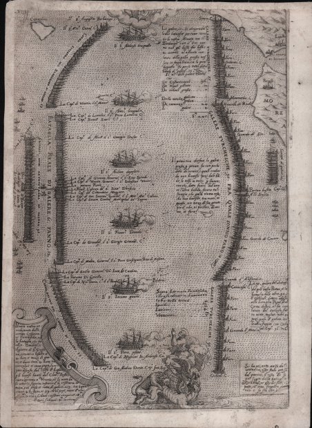 Nel cartiglio in basso a sinistra si legge: Il vero ordine et modo, tenuto dalle armate Cristiana et Turchesca, nella battaglia, che fu ali .7. Ottobrio .1571. il giorno di S.a Giustina, comincio lasalto a 4 hore et meza di giorno, et durò circa 4 hore; tra curzolari et cavo papa, loco poco discosto dal Golfo d[e] Lepa[n]to p[er] li havisi hauti dal Clar.mo Iustiniano venuto a Venetia, co[n] le nove de la vitoria, seguita in favor d[e] la Cristiana armata, con presa et rotta di galere 213, tra le quali erano 40 fano et 39 ne so[n] presi morti de nimici 40m in circa scihavi cristiani ricuperati, 18m in circa, turchi fatti schiavi 4m in circa. In basso, al centro della tavola, che è priva di orientazione, una bella vignetta allegorica mostra un drago con la mezzaluna sul capo - simbolo del nemico turco - assalito e sottomesso dal leone rampante di Venezia e dall’aquila asburgica. Opera molto rara, priva di indicazioni editoriali. Attribuita a Giovanni Francesco Camocio (cfr. Bifolco-Ronca, Cartografia e topografia italiana del XVI secolo, p. 1605). La presente tavola raffigura la Battaglia di Lepanto, la celebre battaglia navale del 1571 che si svolse di fronte a Lepanto, all’estremità occidentale del Golfo di Patrasso. Casus belli era stato l’attacco turco alla città di Famagosta, nel possedimento veneziano di Cipro, avvenuto l’anno precedente, il 22 agosto 1570. La vittoria cristiana contro le armate turche del 1571 ne fermò l’avanzata in Europa e verso Roma, segnando anche l’inizio della decadenza marittima ottomana. Vide coinvolte la flotta turca comandata da Mehmet Ali Pascià (un apostata di origini calabresi, convertitosi all’Islam) e quella della Lega Santa, creata il 20 maggio del 1571 da Papa Pio V: Stato Pontificio, Repubblica di Venezia, Repubblica di Genova, Ducato di Savoia, Granducato di Toscana, Ducato di Urbino, Ducato di Parma, Repubblica di Lucca, Ducato di Ferrara, Ducato di Mantova, Impero spagnolo (con il Regno di Napoli e di Sicilia) e Ordine di Malta, al comando del ventiseienne Don Giovanni d’Austria, figlio naturale di Carlo V e fratellastro del regnante Filippo II.La flotta cristiana era formata da circa 200 galere, di cui oltre la metà erano veneziane al comando del Capitano da Màr Sebastiano Venier, la flotta turca ne aveva circa 250. La prima linea della flotta cristiana era formata da galeazze mercantili veneziane (nell’incisione indicate come “galeaze” sul lato destro, sopra al cartiglio), trasformate per l’occasione, e in soli 100 giorni, in navi da guerra, impiegate per la prima volta ' proprio in questa battaglia, armate di cannoni non solo a prua, ma anche sui fianchi e a poppa, loro potenza di fuoco.La vittoria della flotta cristiana fu piuttosto rapida, anche perché i veneziani attaccarono e affondarono la galeotta del comandante in capo di tutta la potenza turca, Alì Pascià, uccidendolo. La flotta ottomana fu quasi completamente distrutta, con grandi perdite umane e un gran numero di prigionieri. Dieci giorni dopo, la galera di Onfré Zustinian, messaggero di Sebastiano Venier, entrava a Venezia trascinando nell’acqua le bandiere turche: la città sembrava impazzita dalla gioia. Lo stesso succederà poi in tutta Europa.Questo evento costituì un punto focale della storia europea sotto molteplici aspetti: politici, militari, religiosi e tecnologici. Solo poche battaglie sono state tanto celebrate e descritte come quella del 7 ottobre 1571, ed esercitò un poderoso effetto sui contemporanei, anche grazie al determinante contributo dato dagli artisti dell’epoca alla diffusione della sua rilevante e clamorosa importanza, in tempo quasi reale: fogli ' volanti nelle più diverse lingue diffusero in tutti i paesi d’Europa la notizia del grande avvenimento, sia con resoconti, sia con rappresentazioni di questa storica battaglia navale, ancor oggi considerata la più grande del Mediterraneo.Diverse sono le interpretazioni del soggetto che si ebbero a Venez. In the lower cartouche: ' Il vero ordine et modo, tenuto dalle armate Cristiana et Turchesca, nella battaglia, che fu ali .7. Ottobrio .1571. il giorno di S.a Giustina, comincio lasalto a 4 hore et meza di giorno, et durò circa 4 hore; tra curzolari et cavo papa, loco poco discosto dal Golfo d[e] Lepa[n]to p[er] li havisi hauti dal Clar.mo Iustiniano venuto a Venetia, co[n] le nove de la vitoria, seguita in favor d[e] la Cristiana armata, con presa et rotta di galere 213, tra le quali erano 40 fano et 39 ne so[n] presi morti de nimici 40m in circa scihavi cristiani ricuperati, 18m in circa, turchi fatti schiavi 4m in circa. At the bottom, in the center of the panel, a beautiful allegorical vignette shows a dragon with a crescent moon on his head - symbol of the Turkish enemy - attacked and subdued by the lion rampant of Venice and the Habsburg eagle. Very rare work, lacking editorial indications. Attributed to Giovanni Francesco Camocio (cfr. Bifolco-Ronca, ' Cartografia e topografia italiana del XVI secolo, p. 1605). The plate depicts the Battle of Lepanto, the naval engagement in the waters off southwestern Greece between the allied Christian forces of the Holy League and the Ottoman Turks during an Ottoman campaign to acquire the Venetian island of Cyprus, which took place on October 7, 1571.Early in 1570 the Ottoman sultan, Selim II, demanded that the Venetian hand over the island of Cyprus. When the Venetians refused to cede the island, invaded it in 1570.Pope Pius V persuaded Philip II of Spain to join with Venetians to defeat the Turkish attack on Cyprus. Genoa, Savoy, and the Knights of Saint John also agreed to send forces.The Holy League fleet consisted of 108 venetian galley, 81 Spanish galley, and 32 others provided by the pope and other allies. The Turkish fleet consisted of 270 galleys, which were faster and more maneuverable than the Christians'ship but were also smaller and less well protected. The Turkish commander was Uuuch Ali, a former Christian s