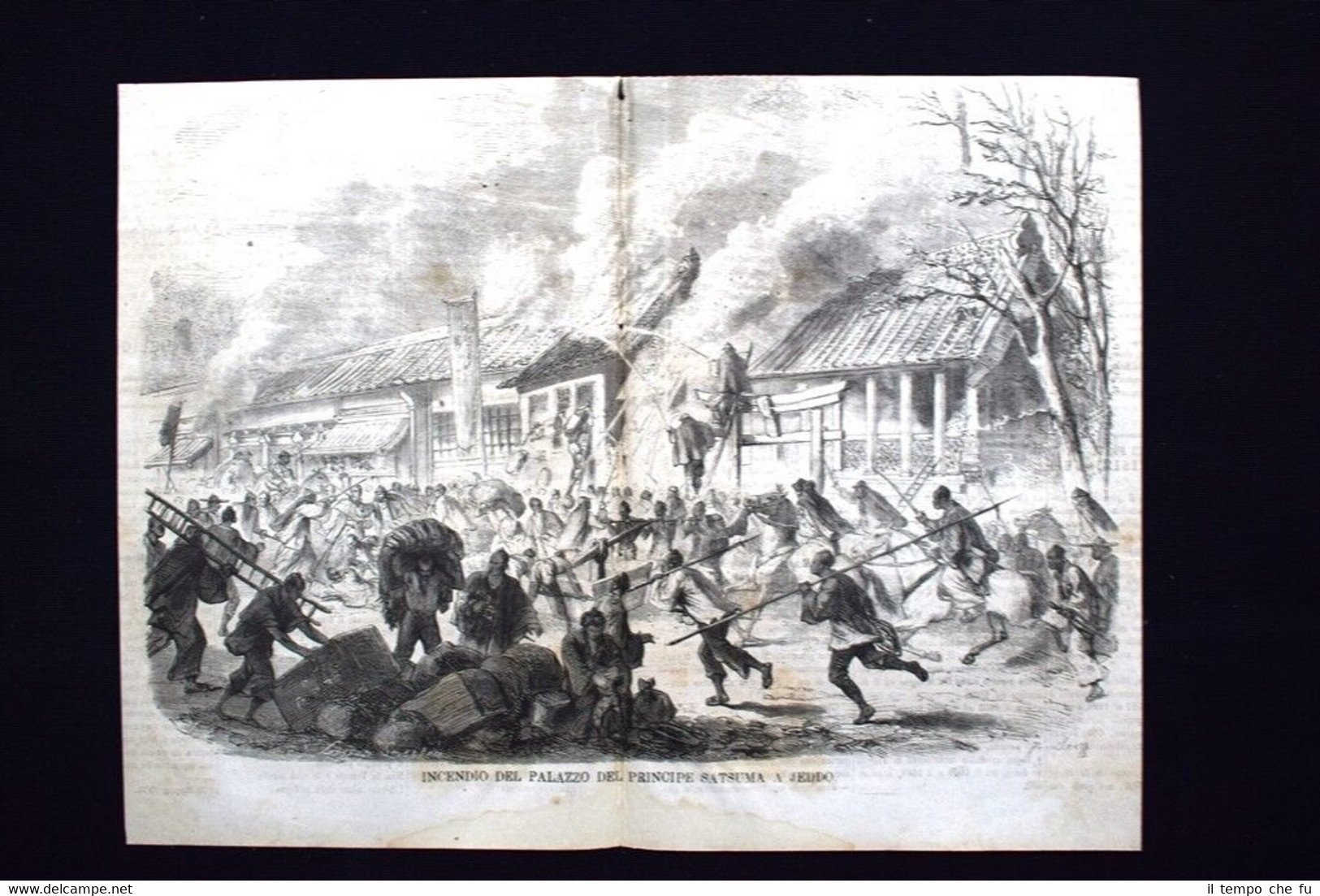 Rara incisione estratta da pubblicazione del 1871. .incisione che ha quindi oltre 146 anni! Incendio del Palazzo del Principe Satsuma a Jeddo, in Giappone Dimensioni Cm 33,00 x 25,00 EP1871 - 012 Qualora vogliate delle scansioni migliori contattateci, soddisferemo ogni vostra richiesta. Paypal Carta di credito Bonifico bancario Accuratamente adagiate su un cartoncino e protette da pellicola trasparente rigida, il tutto viene inserito dentro plico di adeguate dimensioni per proteggerne l'integrità.