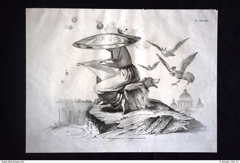 Preziosa ottocentina allegorico - caricaturale Tema: 8 febbraio 1849La Costituzione della Repubblica Italiana raccoglie la tradizione dei padri e i buoni propositi dei moderni, in mezzo al grandinar delle bombe francesi Bella e rara incisione all'acquaforte di satira pungente e dissacrante sui Moti del 1848, detti anche Rivoluzione del '48 o Primavera dei Popoli, che sconvolsero l'Italia e tutta l'Europa nel 1848 e 1849. Estratta dall'introvabile: Don Pirlone a Roma. Memorie di un Italiano dal 1°settembre 1848 al 31 dicembre 1850. Autore: Michelangelo Pinto Editore: Alessandro Fontana Anno di pubblicazione: 1851 DON PIRLONE - 014/CXCVIII Dimensioni Cm 22,00 x 16,00 Qualora vogliate delle scansioni migliori contattateci, soddisferemo ogni vostra richiesta. Contesto storico: I moti del 1848, detti anche rivoluzione del '48 o Primavera dei popoli furono un'ondata di moti rivoluzionari borghesi che sconvolsero l'Europa nel 1848 e nel 1849. Scopo dei moti fu abbattere i governi della Restaurazione per sostituirli con governi liberali. Il loro impatto storico fu così profondo e violento che nel linguaggio corrente è entrata in uso l'espressione «fare un quarantotto» per sottintendere una improvvisa confusione e scompiglio. La prima agitazione europea del 1848 si verificò in Italia: la rivoluzione siciliana che esplose il 12 gennaio di quell'anno, che rappresentò la prima miccia dell'esplosione europea. L'insurrezione siciliana, infatti, spinse in un primo momento i Borbone a concedere il ritorno nell'Isola alla costituzione del 1812. Seguì una rivoluzione a Napoli, il 27, che costrinse, due giorni dopo, Ferdinando II a promettere una Costituzione, promulgata l'11 febbraio. Lo stesso 11 febbraio Leopoldo II di Toscana, cugino primo dell'imperatore Ferdinando I d'Austria, concesse la Costituzione, nella generale approvazione dei suoi sudditi. L'esempio borbonico fu seguito da Carlo Alberto di Savoia con lo Statuto Albertino e da Papa Pio IX con lo Statuto Fondamentale. Solo il re piemontese mantenne però lo Statuto. In Sicilia il parlamento proclamò in marzo l'indipendenza, che sarebbe durata fino al maggio 1849. Nel napoletano la concessione e la successiva repressione delle libertà costituzionali, portò dal maggio al settembre di quell'anno a una serie di moti. In tutto il Regno Lombardo-Veneto scoppiarono rivolte, come le Cinque giornate di Milano che sfociarono nella prima guerra di indipendenza. Nello Stato Pontificio una rivolta interna estromise papa Pio IX dai suoi poteri temporali e portò alla costituzione della Repubblica Romana. La rivoluzione delle Cinque giornate di Milano e altre proteste indussero il Re Carlo Alberto a dichiarare guerra all'Austria. Le truppe vennero presto sconfitte e solo quelle francesi poterono far retrocedere gli austriaci. La successiva ascesa al trono di Vittorio Emanuele II fece del Piemonte il motore propulsore del processo di unificazione italiana che tuttavia si sarebbe ottenuto solo nel 1861. Per quanto i Moti del '48 furono sedati abbastanza velocemente, le vittime furono decine di migliaia: il destino della democrazia europea ci è sfuggito di mano dichiarerà Pierre-Joseph Proudhon. Gli storici concordano che la Primavera dei popoli fu, alla fin fine, soprattutto un sanguinoso fallimento, se si eccettua la concessione dello Statuto Albertino nel Regno di Sardegna da parte di Carlo Alberto di Savoia, l'unica costituzione non revocata di quelle concesse o votate nel 1848-49. Vi furono tuttavia radicali e notevoli effetti a lungo termine: Germania e Italia sarebbero presto arrivate all'unificazione facendo leva anche sulla necessità di autodeterminazione dei popoli. Analogamente l'Ungheria sarebbe giunta ad un parziale riconoscimento della propria autonomia (a discapito della popolazione slava) grazie all'Ausgleich del 1867. In Prussia e Austria fu abolito il feudalesimo, mentre in Russia fu eliminata la servitù della gleba nel 1861. Tavola allegorico - caricaturale sullo stato dell'Italia del tempo, incisione su rame ricca di significato e rappresentazione mediante satirica dissacrante della condizione della nostra penisola oppressa. Le tavole dell'opera furono in parte riprese dal giornale romano Don Pirlone, quotidiano, uscito dal 1 settembre 1848 al 2 luglio 1849 (con una interruzione dl 29 aprile al 7 maggio 1849), ma in parte furono realizzate appositamente per questa opera. Tra gli incisori sono presenti anche i nomi di Ratti, Vaiani, Monneret, Gallucci, Pichi, Masutti. Il titolo Don Pirlone deriva quasi sicuramente da una maschera creata dallo scrittore satirico Girolamo Gigli (1660 - 1722). Si trattava di una specie di Tartufo molieresco, ispirato ad una figura reale, il canonico Feliciati di Sarteano. Nei tre volumi l'avvocato Michelangiolo Pinto raccolse tutto il pubblicato del giornale, che fu il più temuto e allo stesso tempo il più apprezzato tra i molteplici giornali satirici che si pubblicavano nella Roma di Pio IX all'epoca delle grandi riforme volute dal